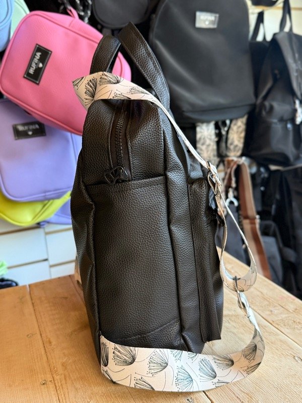 Mochila confeccionada en cuerina de excelente calidad, resistente y fácil de limpiar. Su diseño se destaca por las manijas sublimadas, que le aportan un detalle único y moderno.